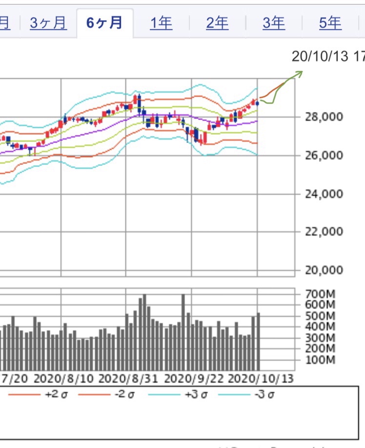 +1σを割ってしまった。残念(>_<)。明日は保有株を整理しておこう。