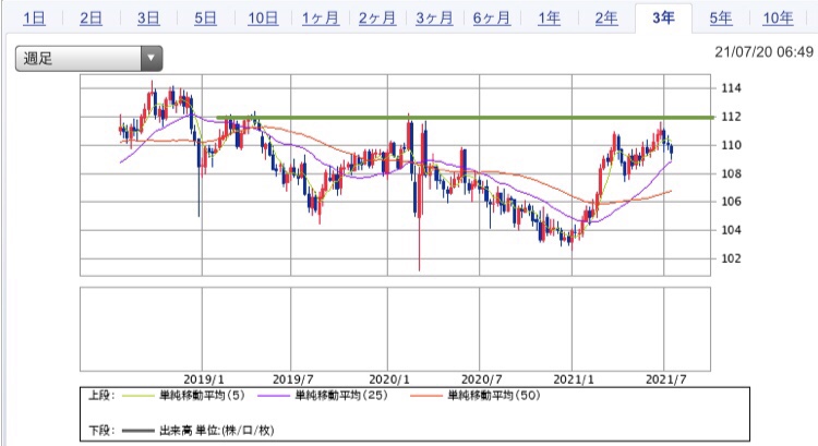 注視している中期トレンド。6/18の下落はサポートラインで反発したので、半年前後はこのラインを割らない想定でいる。そのため、明日も続落したら想定を見直す。