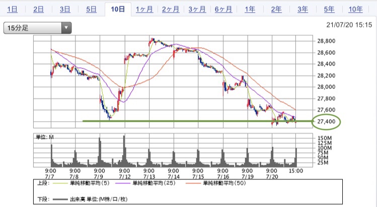 中期では支持線を割っているので、¥27,000辺りまで下げてもおかしくないチャートとなってきた。