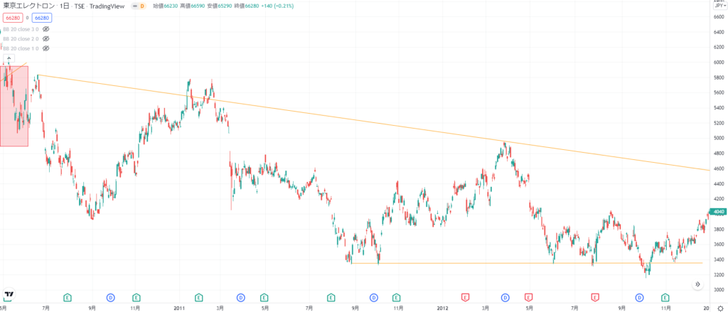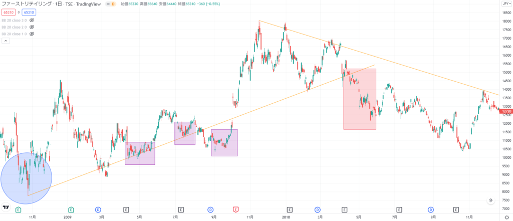 調整局面ではさらに下値を更新(2011/3)してから、支持線を試す場面が2つあった(黒色の四角で囲った部分)。