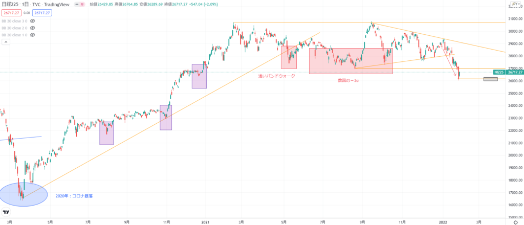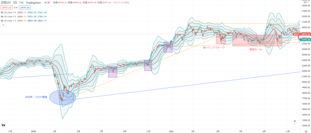 - 2番底等の買い場はボリンジャーバンド-3σ。