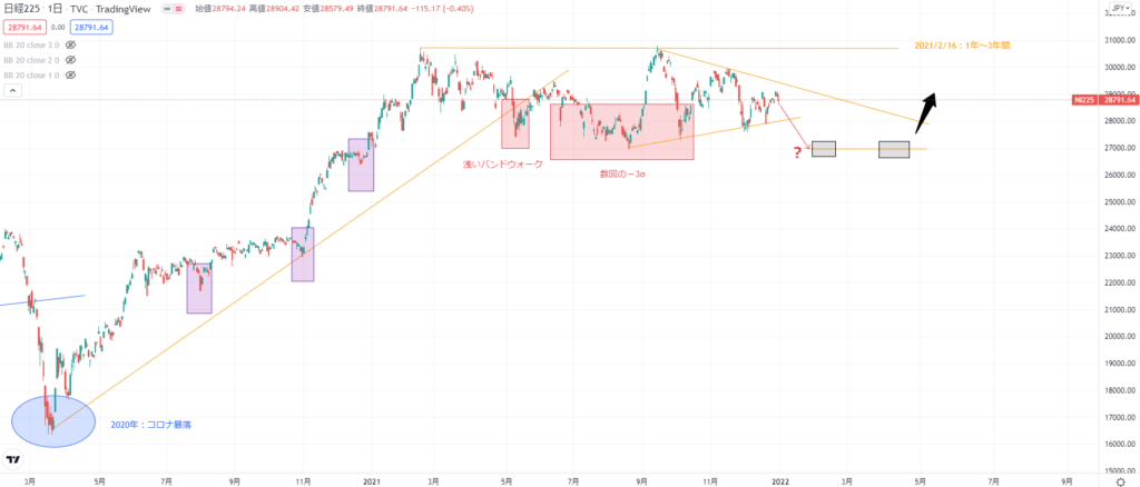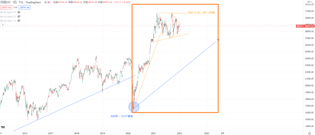 現在(2022/1/1時点)の日経は、大暴落後の上昇が一服して調整局面に入っているとみる。この調整がどこまで続くのかは、これから調整入りすると思われるダウやナスダックに対して日経がどこまで相関するかによると考える。ダウやナスダックの調整は1年弱を想定しておく。